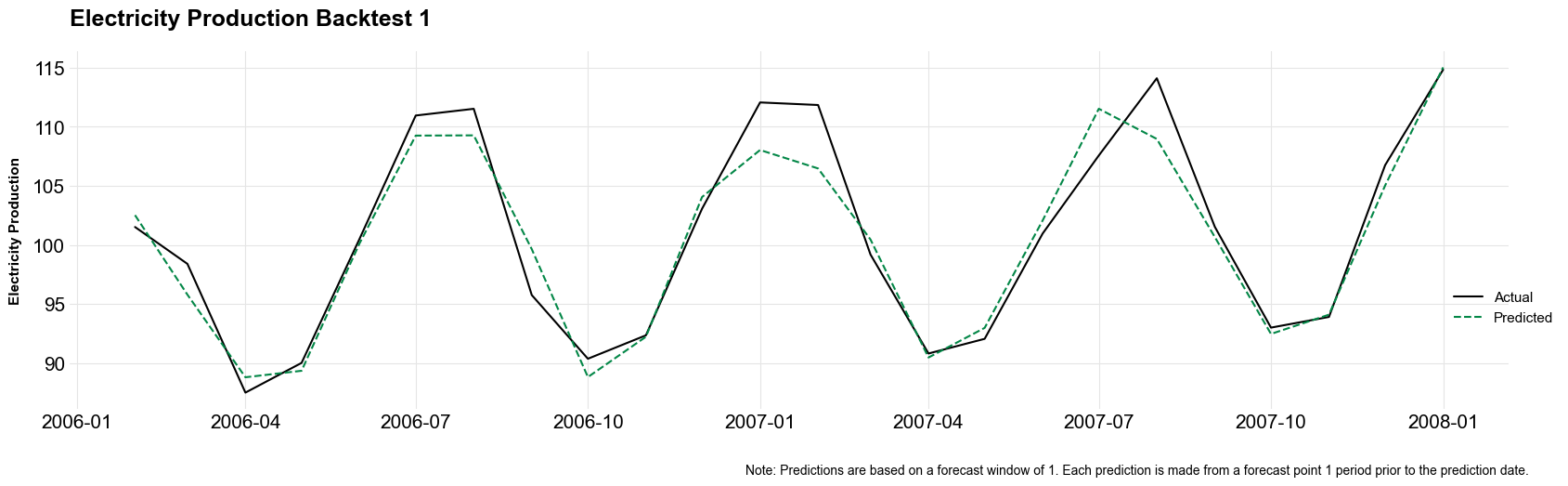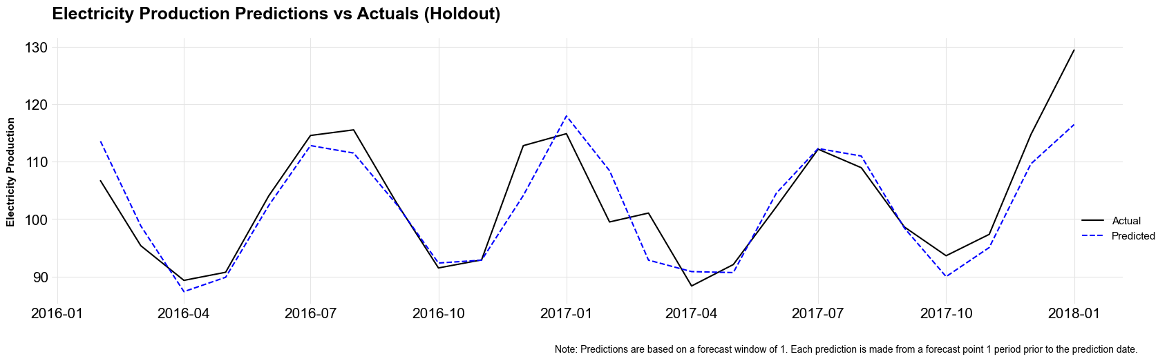 fig.text(0.7, -0.03, "Note: Predictions are based on a forecast window of 1. Each prediction is made from a forecast point 1 period prior to the prediction date.", wrap=True, horizontalalignment='center', fontsize=10)