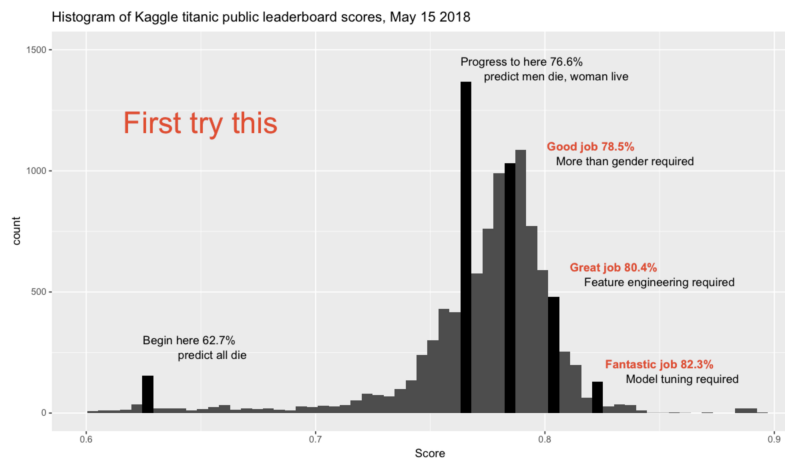 The model correctly predicted survival for 78.7% of passengers. This histogram of others’ accuracy scores helps to contextualize this score (source: https://www.kaggle.com/competitions/titanic/discussion/57447).