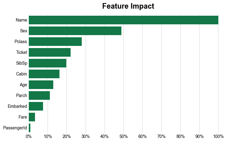 Name is the most important feature in the model. Passenger name captures many demographic dimensions that mattered for surviving the Titanic disaster (sex, age, and class).