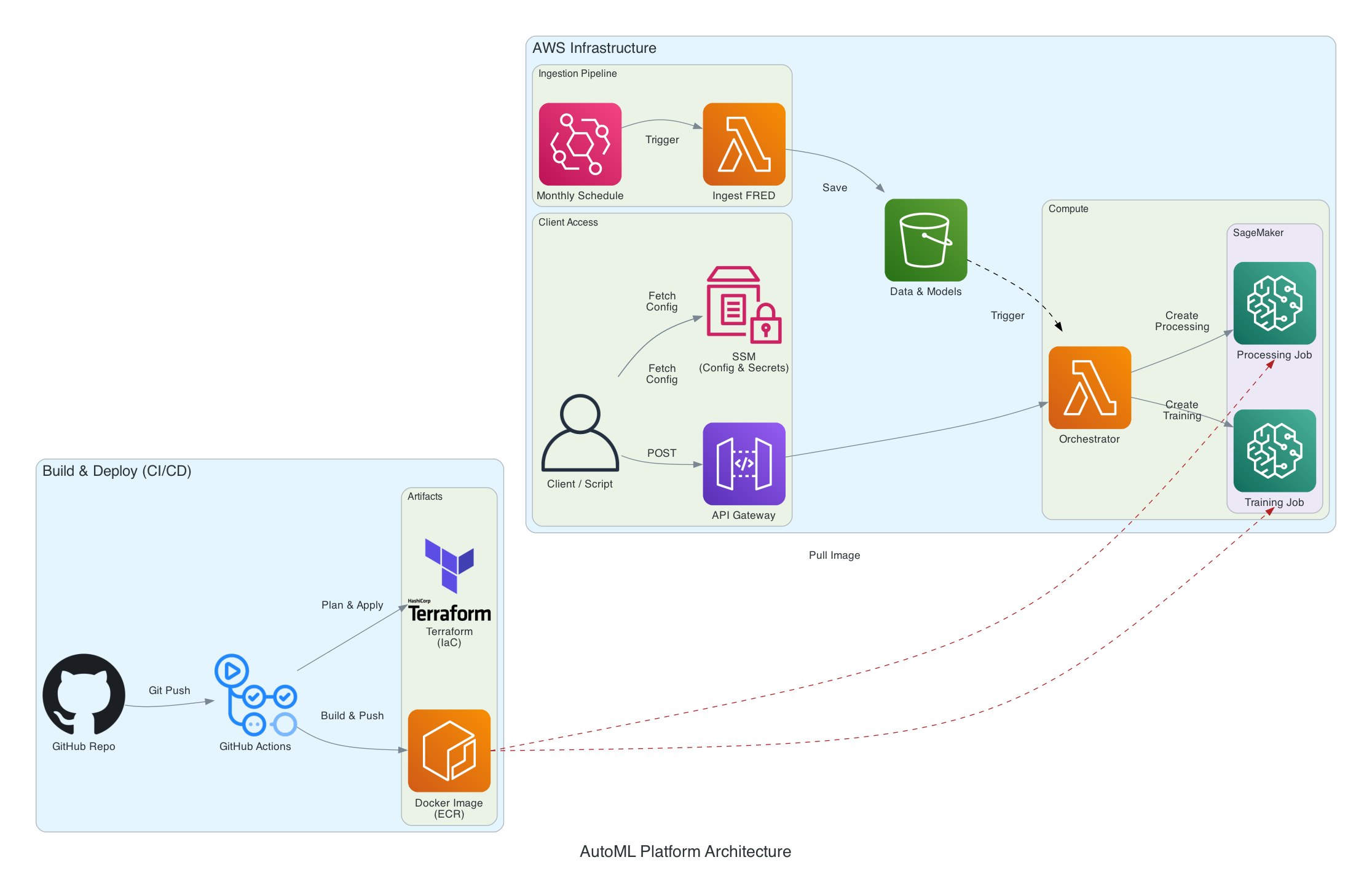 I also set up an EventBridge job to trigger the AutoML tool on a monthly cadence. I configured this in Terraform by creating a Lambda function that runs src/handlers/ingest_fred.py, which uploads FRED (Federal Reserve Economic Database) unemployment data to S3. I created an S3 event notification to trigger the Orchestrator Lambda function whenever it receives new data. This Lambda function handles both the API and the scheduled deployments.