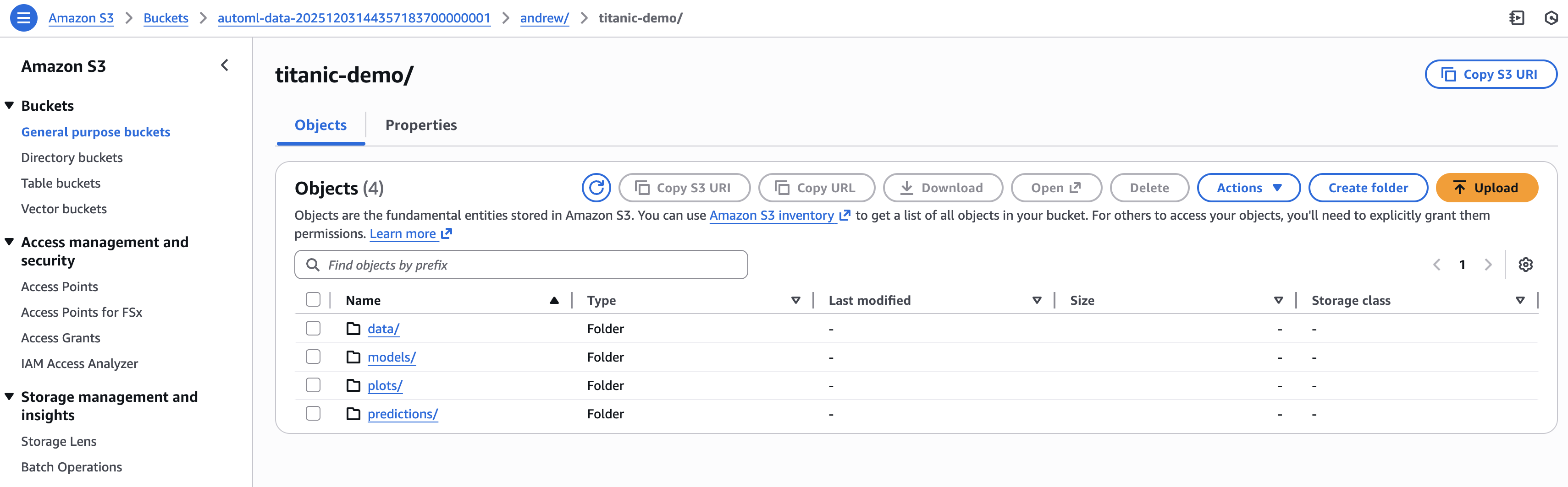 The run_pipeline script in the ref folder demonstrates how to use the API. The script uploads the titanic dataset to S3 and runs AutoML using the train, predict, and plot API endpoints. The image below shows the output in S3 that results from running python ref/run_pipeline.py andrew titanic_demo train test in the command line, where andrew is the user, titanic_demo is the project, and train and test are the Titanic training and prediction datasets.