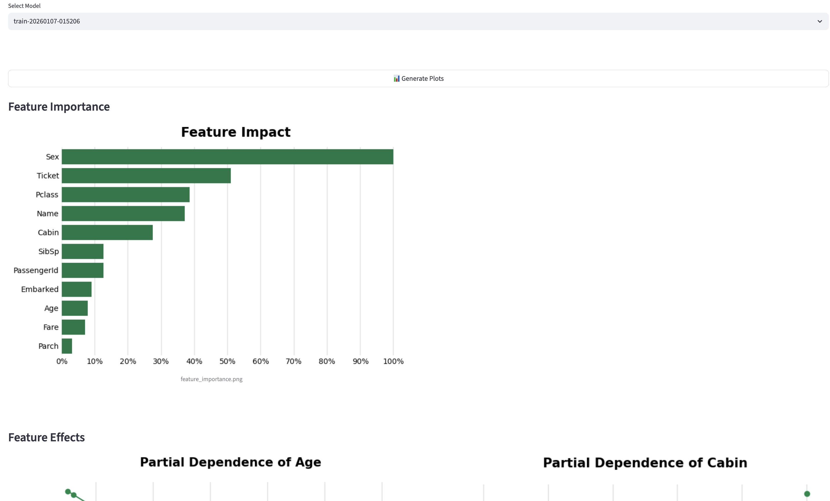 The training call saves a trained model to the models folder. The prediction call gets predictions on test.csv from the trained model and saves them to the predictions folder. The plotting call generates feature importance and feature effects plots using the trained model in models and saves them to the plots folder. One advantage of this deployment method is that the command-line arguments of run_pipeline ensure that multiple people can utilize AutoML for different projects. The model outputs are saved in separate locations in the automl-data S3 bucket.