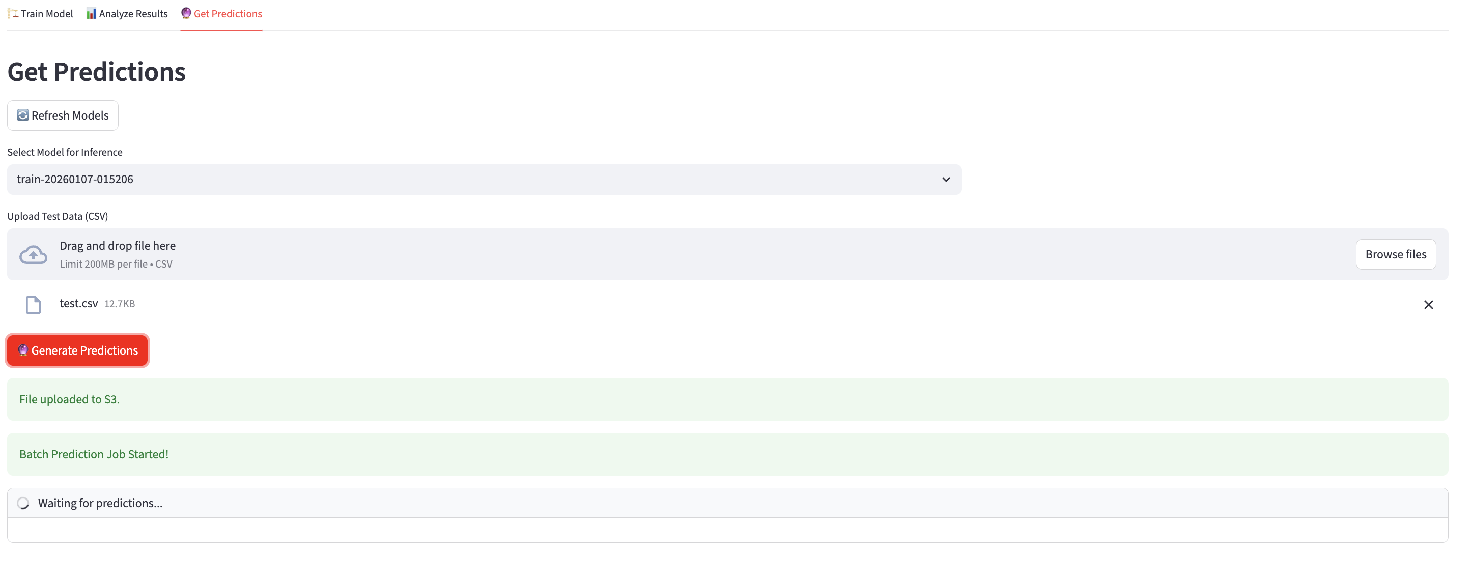 While setting up an API makes a model available to technical users, building a Streamlit app makes it accessible to a wider audience. I created a Streamlit app for AutoML as a proof of concept. To deploy this at an organization, one would need to host the app using a tool like AWS App Runner. Unlike Lambda, which is triggered by an event and runs for a short period of time, an App Runner instance runs 24/7 to ensure the app is always available. My Streamlit app is available in the deployment repo (app.py). I ran the app locally: streamlit run app.py.
