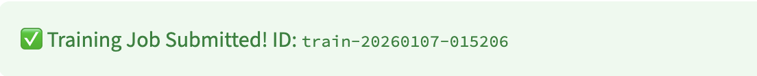 The User ID and Project Name fields in the left menu determine the S3 path to which the trained model is saved. The app notifies the user that the training job has been submitted and shares the job ID.